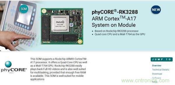 国际知名的处理器及电子技术型公司Phytec,推出了phyCORE-RK3288 ARM CortexTM-A17 System on Module,采用RK3288 SOM做工控板。根据Phytec网站资料描述,瑞芯微RK3288 CPU以及GPU性能强大,可轻松应对全高清视频与多任务,非常适用于移动应用。