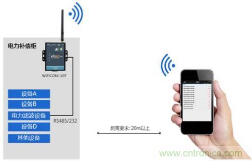 电力补偿装置的巡检一般需要人工开柜进行数据的查看、调整等操作,工作繁琐切具有一定危险性,本项目利用WiFiCOM-10T串口转Wi-Fi???,在传统装置的基础上利用原有的RS-485/232通讯接口快速进行产品升级,将串口数据转化成Wi-Fi信号,巡检人员即可通过手机或iPad进行设备巡检,并实现???、遥测、遥信等功能。
