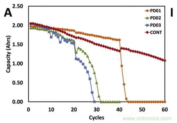 针对三个阶段电池的衰降机理的研究认为,阶段1可能是因为电池SEI膜生长需要消耗一部分Li+,因此衰降速度较快。在阶段2随着SEI膜结构的稳定,内部较为稳定,因此衰降速度较慢,在阶段3随着电池老化,开始发生活性物质损失,电极活性界面减少,导致电池对于电流十分敏感。图C是针对不同的截止电压对电池衰降速度影响的实验,从实验结果可以看到,当把充电截止电压提高到4.3V时会导致电池的循环性能急剧恶化,降低充电截止电压可以有效的改善电池的循环性能。