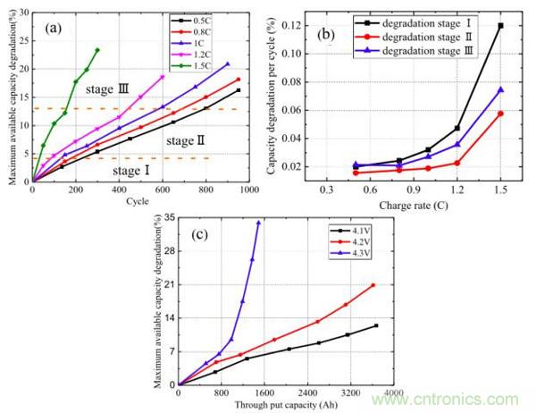 锂离子电池的放电制度很大程度上依赖于使用者,好的放电制度对于有的使用者而言并不一定适用。但是充电制度则主要是设计者进行控制,因此对于充电制度对电池寿命衰降的影响的研究,能够更好的指导我们对锂离子电池的设计。北京交通大学的YangGao等针对不同的充电制度对锂离子电池寿命衰降的影响,并研究了其作用机理,提出了锂离子电池的寿命衰降模型。YangGao的研究显示,当充电电流和截止电压超过一定的数值时,锂离子电池的衰降将被极大的加速,为了降低锂离子电池的衰降速率,需要针对不同的体系,选择合适的充放电电流和截止电压。