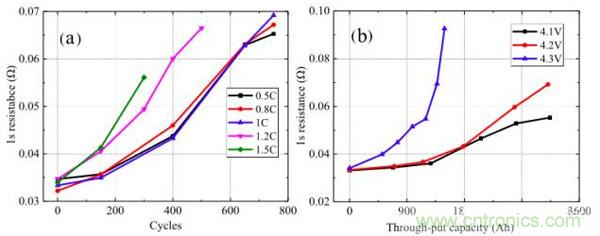对电池的动态内阻分析如下图所示,从图a测试结果来看,当充电电流小于1C时,电池动态内阻随着电池循环的变化趋势几乎时一样的,但是当充电电流超过1C时,电池动态内阻增加速度会随着充电速率的增加而快速增加。从图b的测试结果来看,当充电截止电压为4.3V时,电池动态内阻增加非常迅速表明高截止电压会恶化电池的动力学条件,截止电压为4.1V和4.2V时电池动态内阻增加较为缓慢。