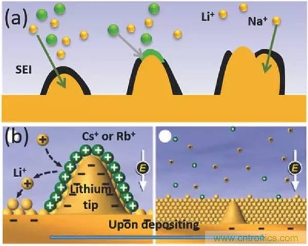 b)自愈式静电屏蔽机制。Cs+或Rb+将积聚在尖端附近以形成静电屏蔽,排斥Li+沉积在负极附近区域。