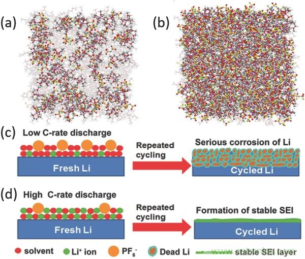 c-d)低速率高速率放电时,锂金属负极上的SEI演变。