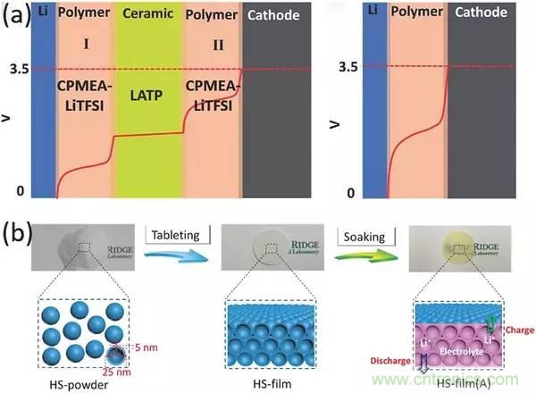 a)聚合物/陶瓷/聚合物-三明治电解质(左),内部曲线是固体混合电解质和单个固体聚合物电解质的电势分布图(右);