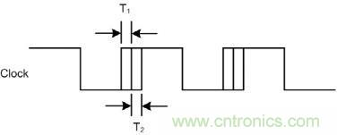 时钟信号边沿变化的不确定时间称为时钟抖动,如图 2所示。一般情况下的时序分析是不考虑时钟抖动,如果考虑时钟抖动,则建立时间应该是Tsu+T1,保持时间应该是Th+T2。