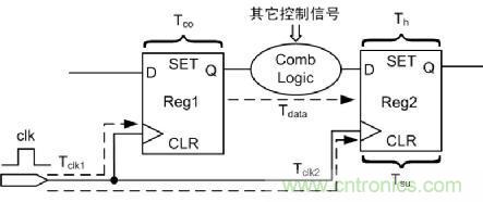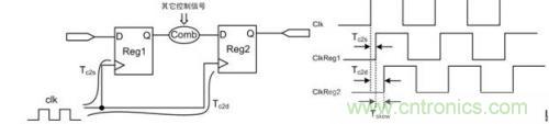 时序偏斜分析图如图 3所示。时钟的分析起点是源寄存器(Reg1),终点是目标寄存器(Reg2)。时钟在图中的结构中传输也会有延迟,时钟信号从时钟源传输到源寄存器的延时为Tc2s,传输到目标寄存器的延时为Tc2d。时钟网络的延时为Tc2s与Tc2d之差,即Tskew=Tc2d-Tc2s。