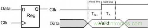 建立时间(Setup Time)常用Tsu表示,指的是在触发器的时钟信号上升沿到来以前,数据和使能信号稳定不变的时间,如果建立时间不够,数据将不能在这个时钟上升沿被打入触发器,使能信号无效,也就是说在这个时钟周期对数据的操作时无效的;保持时间(Hold Time)常用Th表示,指的是在触发器的时钟信号上升沿到来以后,数据和使能信号稳定不变的时间,如果保持时间不够,数据同样不能被打入触发器,对数据的操作同样是无效的,使能信号无效。数据要能稳定传输,就必须满足建立时间和保持时间的关系,图 4标识了它们间的关系。