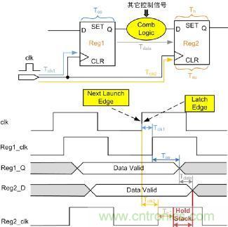 如图 6所示,为分析建立时间/保持时间的基本电路图。Tclk1为Reg1的时钟延时,Tclk2为Reg2的时钟延时,Tco为Reg1固有延时,Tdata为Reg1的到Reg2之间组合逻辑的延时,Tsu为Reg2的建立时间,Th为Reg2的保持时间,设时钟clk周期为T,这里分析数据的建立时间和保持时间。