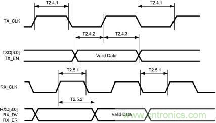 DT6000S项目上有4路光以太网接口连接到FPGA,由FPGA进行实现MAC层和解码IEC61850的SV和GOOSE。以太网PHY通过MII接口和FPGA,因此FPGA与外部的接口有4路MII接口。项目初期是实现1路光以太网接口,并且验证功能正确之后,但是后期变成的4路光以太网时,总会存在1路光以太网通信不正常。经过分析得到是FPGA通MII接口和PHY的时序不满足。如图 9所示为MII接口的时序图,时序不满足分为TX_CLK和RX_CLK。