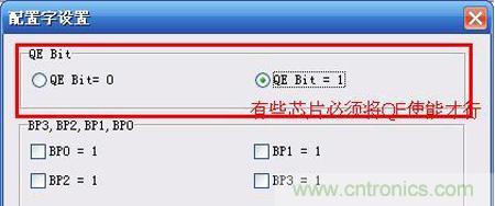 芯片中的配置参数需要手动修改,不能单纯的加载文件后直接进行烧录,如果不按照正确的规则设置参数,必然会导致芯片无法正常运行。在SPI Flash的芯片烧录时经常遇到这类问题,类似于”QE”位必须使能,如下图。