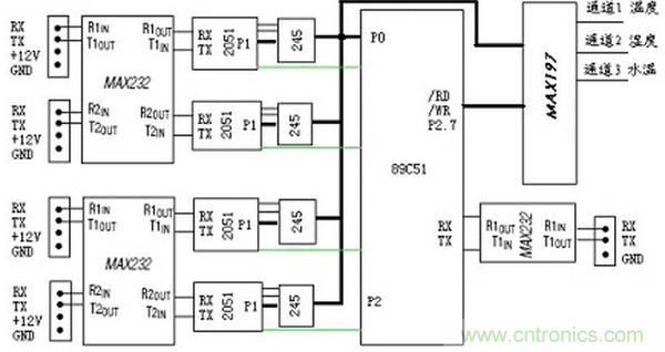 · 各从机上电初始化后接收传感器串行数据,然后通过P1口接收主机地址,当地址与自己相符后,调整245方向并由245向主机发送传感器数据,此过程由握手线负责控制。