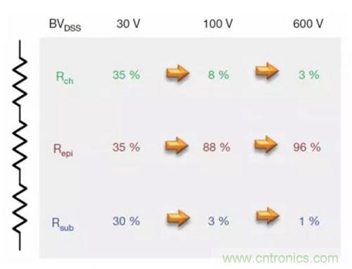 图2显示平面式MOSFET情况下构成RDS(on) 的各个分量。对于低压MOSFET,三个分量是相似的。但随着额定电压增加,外延层需要更厚和更轻掺杂,以阻断高压。额定电压每增加一倍,维持相同的RDS(on)所需的面积就增加为原来的五倍以上。对于额定电压为600V的MOSFET,超过95%的电阻来自外延层。显然,要想显著减小RDS(on)的值,就需要找到一种对漂移区进行重掺杂的方法,并大幅减小epi电阻。
