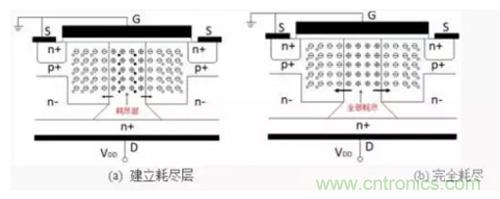 垂直导电N+区夹在两边的P区中间,当MOS关断时,形成两个反向偏置的PN结:P和垂直导电N+、P+和外延epi层N-。栅极下面的的P区不能形成反型层产生导电沟道,P和垂直导电N+形成PN结反向偏置,PN结耗尽层增大,并建立横向水平电??;同时,P+和外延层N-形成PN结也是反向偏置形,产生宽的耗尽层,并建立垂直电场。由于垂直导电N+区掺杂浓度高于外延区N-的掺杂浓度,而且垂直导电N+区两边都产生横向水平电场,这样垂直导电的N+区整个区域基本上全部都变成耗尽层,即由N+变为N-,这样的耗尽层具有非常高的纵向的阻断电压,因此,器件的耐压就取决于高掺杂P+区与低掺杂外延层N-区的耐压。
