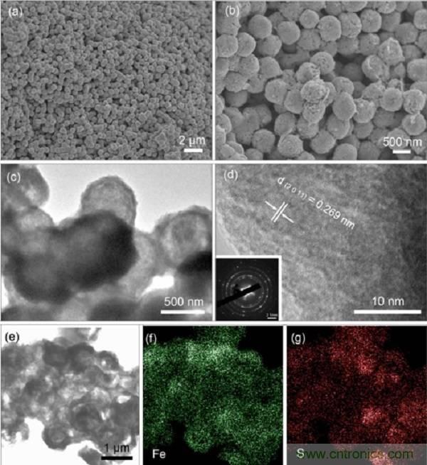(a,b)Fe1-xS纳米材料在不同放大倍率下的扫描电子显微镜(SEM)图像;(c,d)Fe1-xS纳米材料的投射电子显微镜(TEM)图像,插图:电子衍射图像;(e-g)Fe1-xS纳米材料各元素的EDX面扫描图。