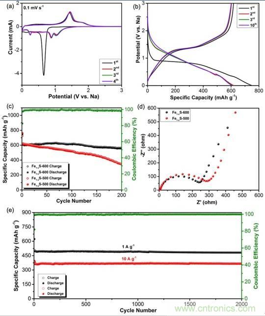 Fe1-xS纳米材料的(a)CV图;(b)充放电曲线图;(c)循环稳定曲线;(d)交流阻抗图;(e)不同充放电倍率下循环稳定性曲线。