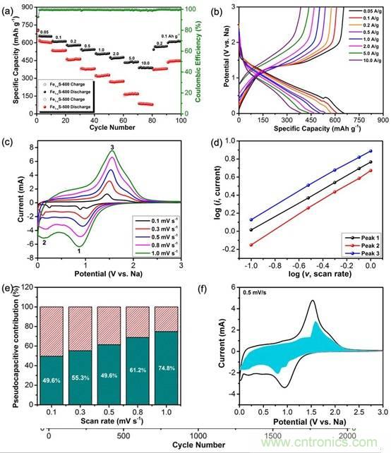 Fe1-xS纳米材料的(a)倍率性能曲线;(b)相应倍率下充放电曲线;(c)不同扫速下的CV曲线;(d)相应氧化还原峰下的log i vs. log v曲线;(e)不同扫速下的赝电容贡献;(f)扫速为0.5 mV s-1时,CV曲线及相应赝电容所占比例。