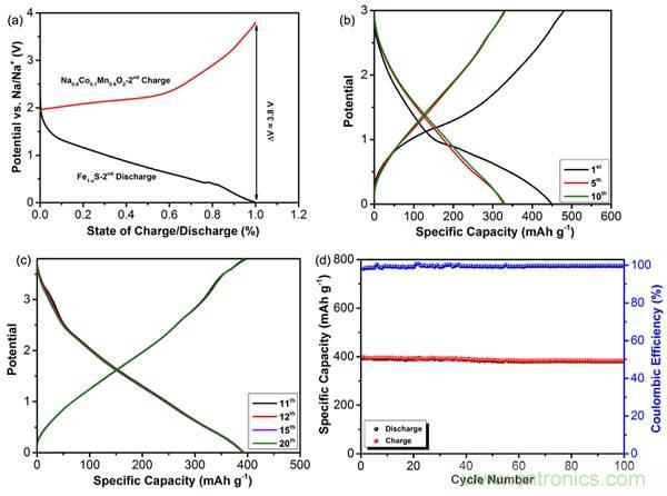 (a)Na0.6Co0.1Mn0.9O2正极和Fe1-xS负极充放电曲线对比;Na0.6Co0.1Mn0.9O2/Fe1-xS全电池在电流密度20 mA g-1时的电化学性能(b,c)充放电曲线;(d)循环稳定性曲线。