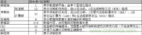 目前使用最广泛的CAN-bus网络标准是V2.0版本,该标准又分为A、B两部分,它们主要的区别在仲裁区域的ID码长度。其中CAN2.0A(标准?。┪?1位ID,CAN2.0B(扩展?。┪?9位ID。下表1为CAN报文结构: