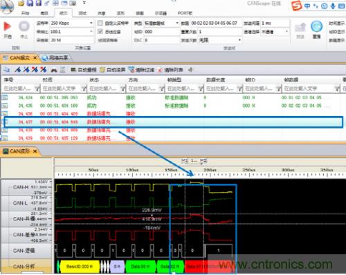同时使用两个CAN卡发送ID为000H数据为01020304050607H的CAN帧,CANScope做通信监控。首先,我们不勾选“总线应答”选项,使CANScope工作在仅监听模式。实验结果如图6所示,出现的是应答定界符格式错误。