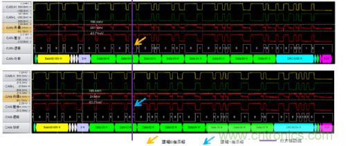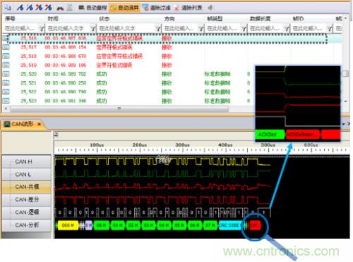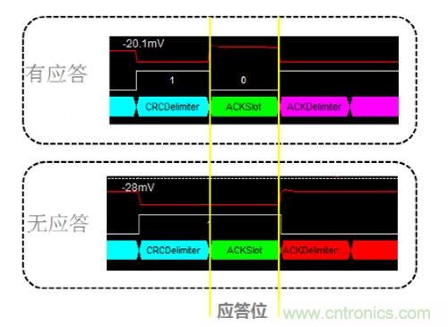 为什么会发生这种错误呢?发送报文的节点会在ACK段发送两个隐性位,若在第一个位期间接收到显性电平则认为该帧被正确接收。由于仲裁段相同时两节点都认为自己取得仲裁权,在ACK段等待应答,但该网络中仅存在两个节点,因此在ACK段不能收到应答,进而发生应答定界符错误。简单说来这种情形就类似于总线中只有一个节点将不能实现数据发送。图7是在ACK段有无应答时的波形对比。