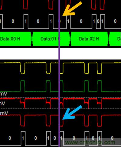 现在我们聚焦数据段,第一个字节数据相同,均为为00H;第二个字节数据不同,分别为01H、02H。图5箭头标示处可以看到两者对应位的逻辑分别为0和1。前面我们提到CAN节点在发送报文的同时会检测总线电平是否与自己发送的电平一致,若不一致发生在非仲裁区域则触发相应错误,因此若这两帧报文同时发送到总线上必将发生位发送错误。因为位发送错误会引起节点发送违反填充规则的6个显性位(主动错误破坏该帧数据),故出现数据场填充错误,如图3。