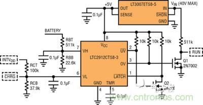 用 LTC2912-3 实现之前介绍的大部分功能。这款具闭锁控制的电压监视器在图 2 所示电原理图的中央。