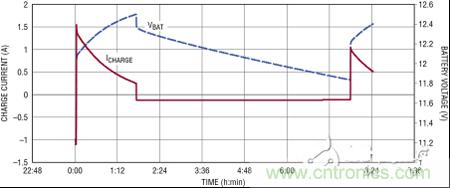 为了验证电路功能,将一个数据记录器连至充电器-电池系统。对电池电压和电流进行采样和存储。为了方便电池的自放电并缩短放电时间,在电池端子之间连接一个 100Ω 电阻器。所产生的图形如图 3 所示。在周期一开始时,输入电压 VIN 被断开,电池放电,并向负载提供“负”电流。然后,加上 VIN 后,充电周期启动,“正”的充电电流流进电池。当电池充满电以后,充电器关断,电池开始自放电。当电池电压达到最小值时,充电器接通,周期自我重复。