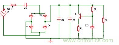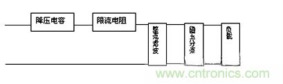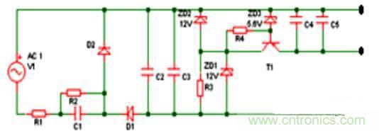 电路由降压电容,限流,整流滤波和稳压分流等电路组成。1.降压电容:相当于普通稳压电路中的降压变压器,直接接入交流电源回路中,几乎承受全部的交流电源U,应选用无极性的金属膜电容(METALLIZED POLYESTER FILM CAPACITOR)。2.限流电路:在合上电源的瞬间,有可能是U的正或负半周的峰_峰值,此时瞬间电流会很大,因此在回路中需串联一个限流电阻,以保证电路的安全。3.整流滤波:有半波整流和全波整流,与普通的直流稳压电源电路的设计要求相同。4.稳压分流:电压降压回路中,电流有效值I是稳定的,不受负载电流大小变化的影响,因此在稳压电路中,要有分流回路,以响应负载电流的大小变化。