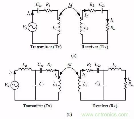 图1:无线输电(WPT)设计中所用补偿电路拓扑有四种,这里是其中两种:(a)SS拓扑,(b)LCL-LCL拓扑。
