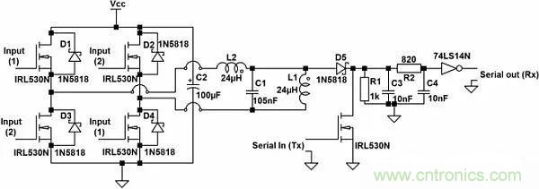 现在双向输电电路可以基于LCL逆变器来构建,其中,两个反相方波分别输入到四MOSFET逆变器的1号和2号输入端,见图4。