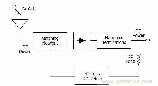 这种设计先通过天线捕获24GHz信号,然后将信号送到整流器——该整流器前面有一个输入匹配网络,用于最大程度地将电能传输给谐波端接网络(HTN)。例如,谐波端接网络(HTN)对二极管在奇次谐波下提供开路阻抗,在偶次谐波下提供短路阻抗。谐波端接网络还能将射频分量从直流分量隔离。无过孔直流返回通路取消了信号到地的过孔,因此不会产生毫米波频率下可能产生的严重寄生问题,详见图6。