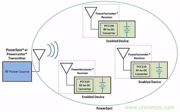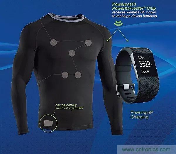 可穿戴设备设计人员可以将Powercast公司的Powerharvester IC嵌入到可穿戴设备中,为一个或多个设备提供一定距离的无线充电。通过收集ISM频段的射频能量,这种IC可以向可穿戴设备的电池提供涓流充电。这种方法支持可水洗的密封设备。