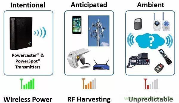 在壁橱或梳妆台抽屉中可以安装类似手机发射器的小功率射频发射器。这种发射器可以为可穿戴服装提供充电区域。不管可穿戴设备是在壁橱里还是在抽屉里,这些设备的电池都能自动接收涓流充电。这种方法与接收器需要依赖一定频率范围内的随机射频信号的场景不相干。图9给出了射频电源种类。