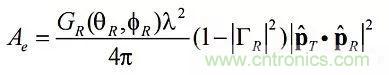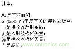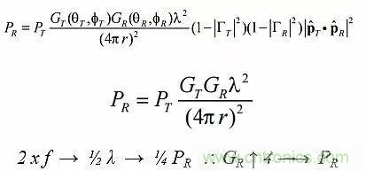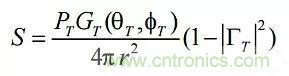 其中: PT是发射功率; r是天线范围或距离; ΓT是发射器反射系数; GT(θT,ΦT)是与角度有关的发射器增益。