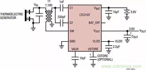 凌力尔特公司有一种基于LTC3107的能量采集解决方案,可用于给无线系统网络和充电电池进行供电,见图16。