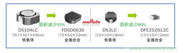 同等特性时(感值、饱和电流等),金属合金功率电感比铁氧体功率电感的外形尺寸小50%左右,可以实现小型化和薄型化。