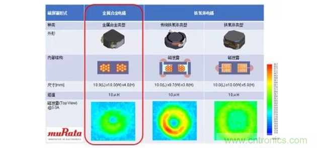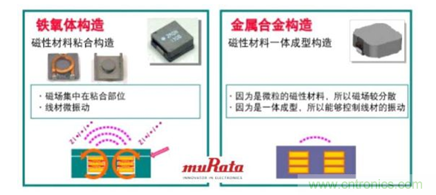 对于金属合金构造的电感来说,因为形成线圈的磁性材料是微粒的,所以磁场较分散;一体成型构造也能够控制线材的振动,从而很难产生啸叫问题。