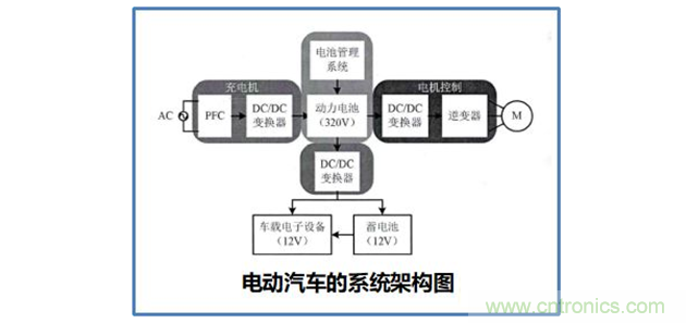 另一方面,DC/DC变换器可以将电动机制动刹车时由机械能转化而来的电能回馈给蓄电池组,其效率高达85%~95%,远大于发电机的正常效率。以可控的方式给蓄电池组充电,尤其是在电动汽车需要频繁启动和制动的城市工况运行条件下,可以有效地回收制动能量,增加电动汽车的行驶里程。因此,电动汽车采用DC/DC变换器可以优化电动机控制、提高电动汽车的整体效率和性能。下图为电动汽车的系统架构图。