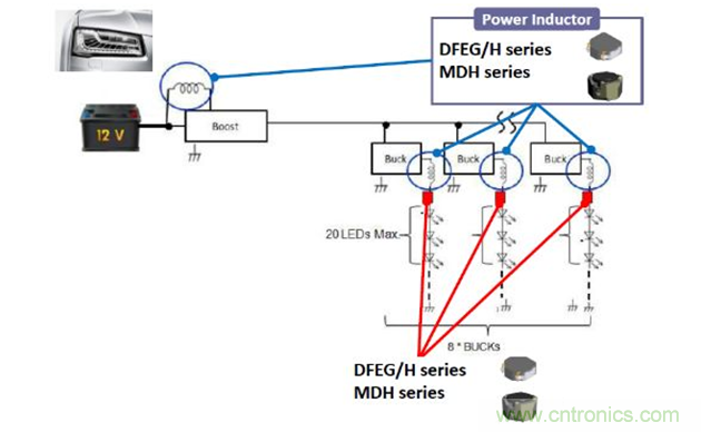 在汽车应用中,目前车灯广泛采用LED光源,因此会用到Boost DC/DC和Buck DC/DC等转换器。