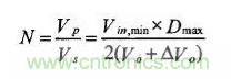 变压器的变比与变换器的传输功率、主电路拓扑结构以及占空比相关。越大,变压器原边的电流越小,原边总的损耗越小,同时副边整流管要承受的电压应力也越小,变压器的效率越高。同时,应能满足在所有输入电压范围内都能得所需要的输出电压,因此,在计算变压器变比的时候应考虑在最小输入电压情况下输出满载且占空比最大进行。