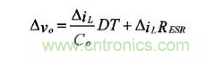 输出滤波电容的选择应考虑工作频率、输出电流纹波、输出电压纹波和能量储存能力。电解电容的等效串联电阻(ESR)会随开关工作频率的变化而变化。输出电压的纹波由以下公式给出: