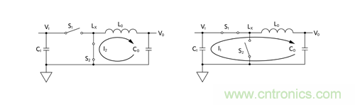 最大程度减小高 di/dt 电流环路:将 LO、CO 和 S2 正确布置在一起,最大程度减小 I2 电流环路。然后,使这一组元件靠近 S1 和 C1,最大程度减小 I1 电流环路。使用 buck 调节器 IC(即集成功率开关 S1 和 S2 的 buck 控制器)时,选择具有好的引脚排列从而支持这种最小化的 IC 非常重要。相同道理也适用于使用电源??榈那榭?。