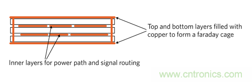 b.PCB 的顶层和底层布局带有屏蔽接地区域,利用一个过孔将其连接起来,以模拟法拉第笼。所有高 di/dt 环路布置在 PCB 的内层,所以法拉第笼就能够屏蔽电磁场, 防止向外辐射。该方法成本较低,通常足以抑制 EMI。图 10 为该技术的示意图。