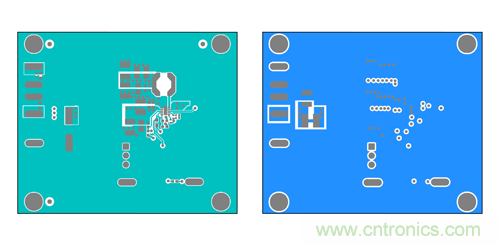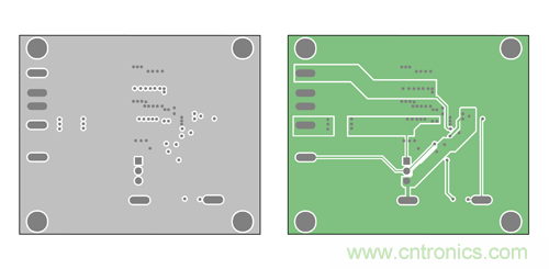 现在,我们以 Maxim 的喜马拉雅 MAX17502 宽输入范围 IC 为例,器件工作在 4.5-60Vin、0.9- 54Vout,提供 1A 负载电流。以下为 MAX17502 EMI 评估板 PCB 的布局,采用了法拉第屏蔽技术 (b)。图 11a 所示为顶层和底层,用作法拉第屏蔽;图 11b 所示为内部第二层和第三层,用于布线。这里的第二层用作额外屏蔽,也可用于布线。该布局中,高 di/dt 电流环路 I1 和 I2 布置在第三层, 被完整笼罩在法拉第屏蔽中。