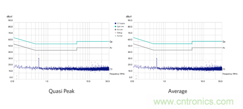 图 12:MAX17502 EMI 评估板传导 EMI 测试结果。左:准峰值;右:平均值。