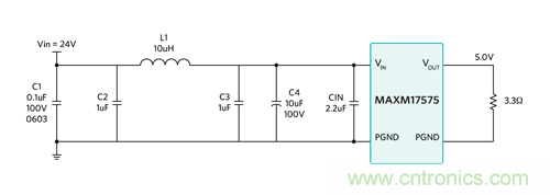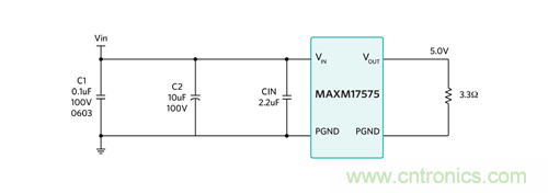 例:以 Maxim 的喜马拉雅 SiP 电源???MAXM17575 为例,器件采用 4.5-60Vin、0.9-12Vout,提供最大 1.5A 电流。以 MAXM17575 评估板为例,最小输入电压为 7.5V。输出负载为 RO = Vo/Io = 5V/1.5A =3.3?。最大工作占空比为 D = VO/VINmin = 5V/7.5V = 0.66。所以,最低可能输入阻抗为 RIN = RO/D2 = 3.3 ?/0.662 = 7.6?。