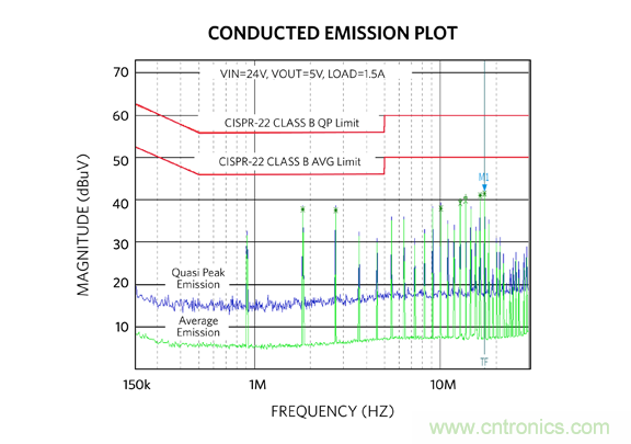 以下为 MAX17502 EMI 评估板的 EMI 测试结果,以非常好的裕量通过了 CISPR 22 标准 B 类要求。