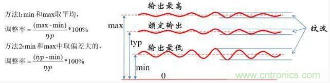 ■注意区分调整率和纹波,纹波是输出的动态特征,而调整率是让电源 工作在极限外部条件下,输出的极限偏差。