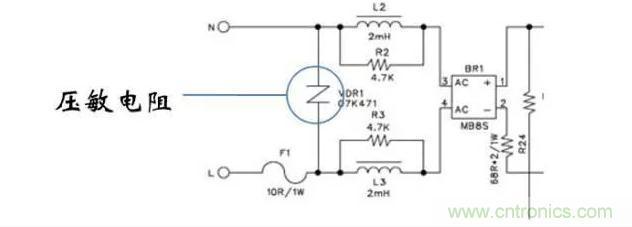 ■大功率设备断开或接入电网时,会使得电网电压上升或跌落。为了保 护电源,有时会使用一个压敏电阻接在输入端。