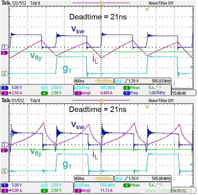 对于half bridge 实现ZVS turn on,我们希望当上管Q1开启时电流是流进switching node (vsw)的,也就是图中电感电流为负值,当下管Q2开启时我们希望电流是流出switching node (vsw)的,也就是电感电流为正值。为什么这样就可以实现ZVS turn on了呢?我们就看上管Q1开启过程。如果电感电流iL为负,这时候我们先关闭Q2,这时候Q1还未开启,在这个deadtime中iL会charge Q2的Coss,使Vsw抬高到Vin,当然不能超过Vin,因为Q1的body diode会导通,钳位住Vsw到Vin,这时候Q1的Vds就是Vin-Vsw=0,这时候我们开启Q1就实现ZVS了。同理对于Q2开启时,如果电感电流为正,那么当我们首先关闭Q1管时,Vsw就会被电感电流拉低到0,因为iL》0, Q2的Coss会discharged到0,然后我们再开启Q2,就可以达到ZVS了。这里我有一张其他Topology的PWM converter的波形图,也和buck工作原理类似,大概可以看看基本原理,也就是电感电流为负时,Q1可以实现ZVS,让Vsw的ringing比较小。而当电感电流为正时,实现不了ZVS,Vsw的ringing就比较大了。